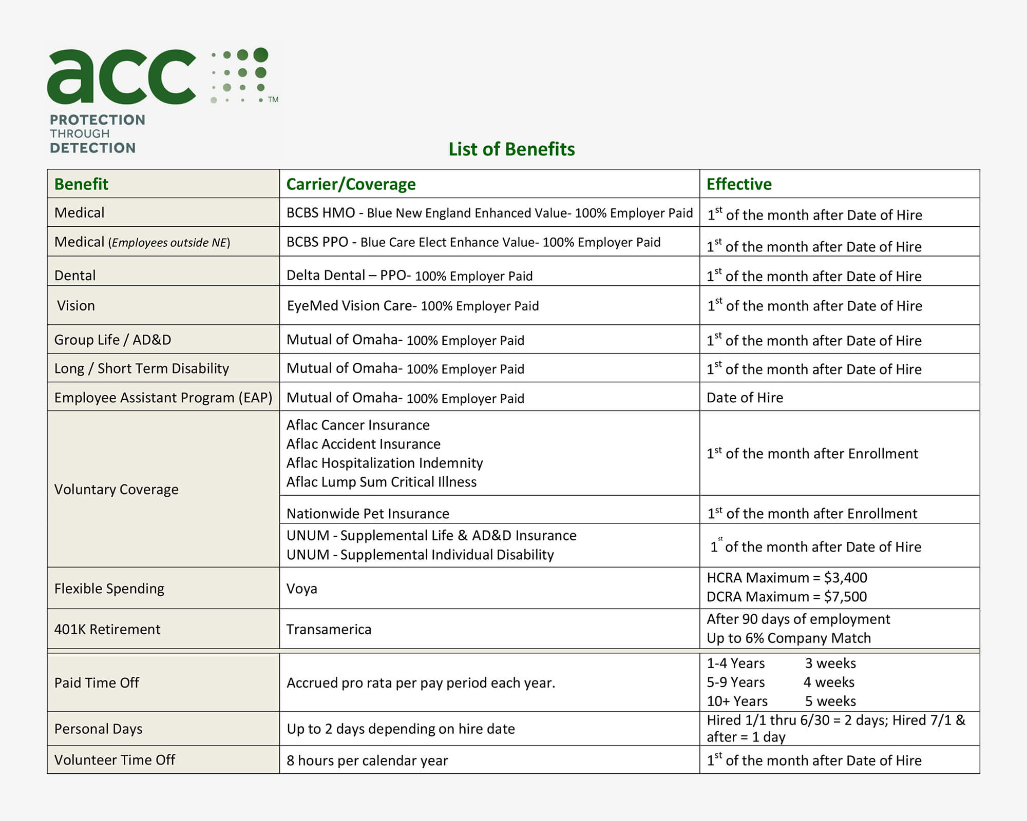 ACC offers employees a robust benefits package, competitive salaries, and a supportive work culture ideal for professional growth. ACC’s commitment to employee well-being starts with comprehensive healthcare coverage, including paid medical, dental, and vision plans, and extends to life and disability insurance to ensure employees feel secure and valued. Additionally, ACC provides a generous retirement savings plan with company matching, helping team members prepare for a strong financial future.